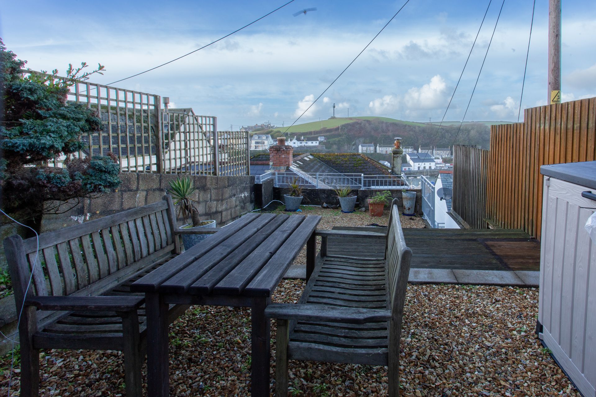 At the side of the cottage you’ll find steps up to the patio area with garden furniture and store ideal for hanging wetsuits etc.