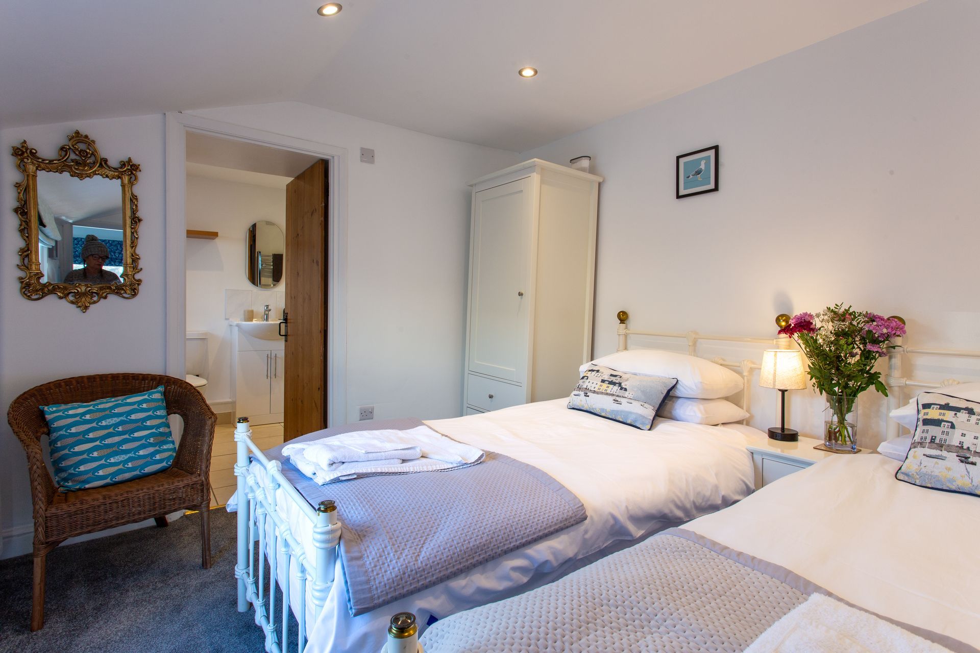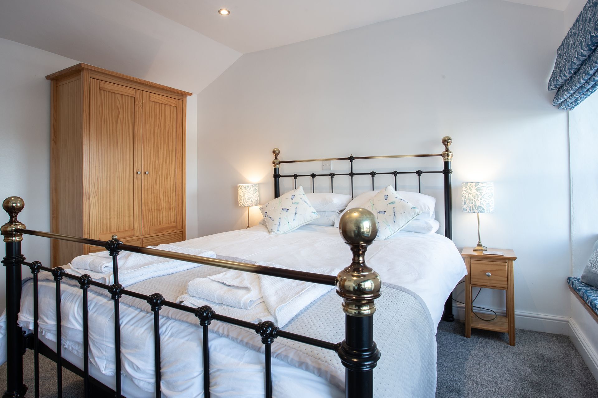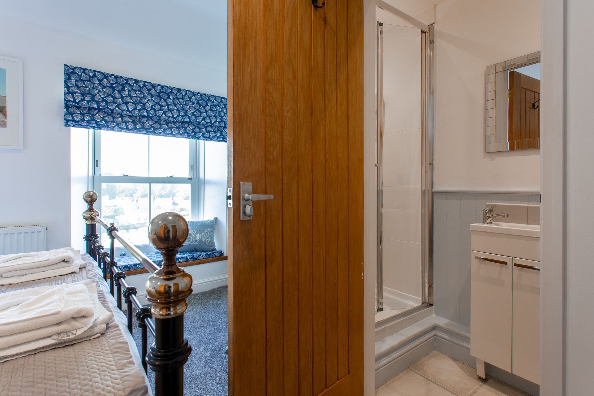 Upstairs you’ll find the master bedroom with a king bed, ample clothing storage and en-suite shower room with shower cubicle, WC hand basin and heated towel rail.