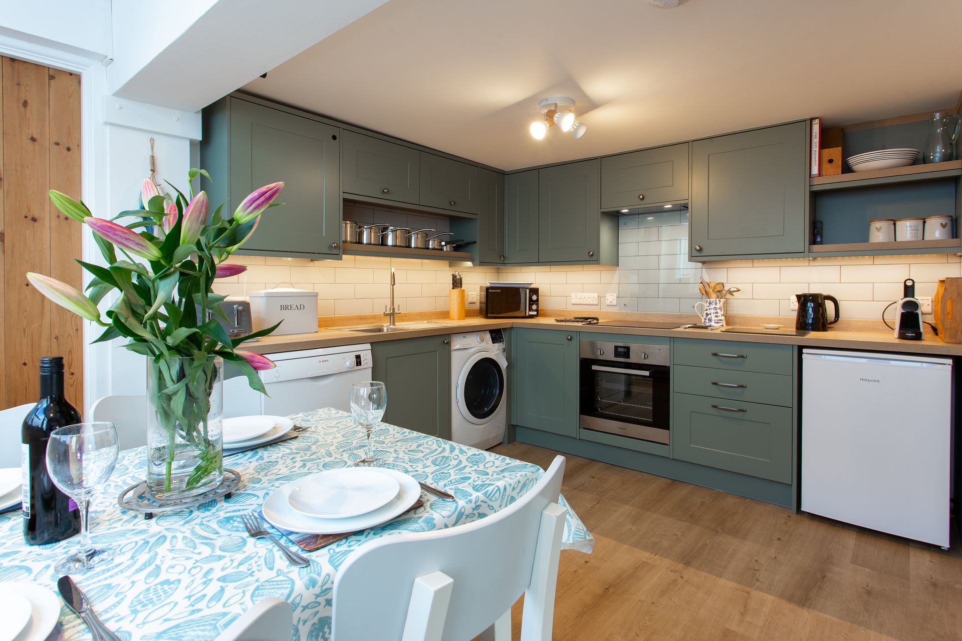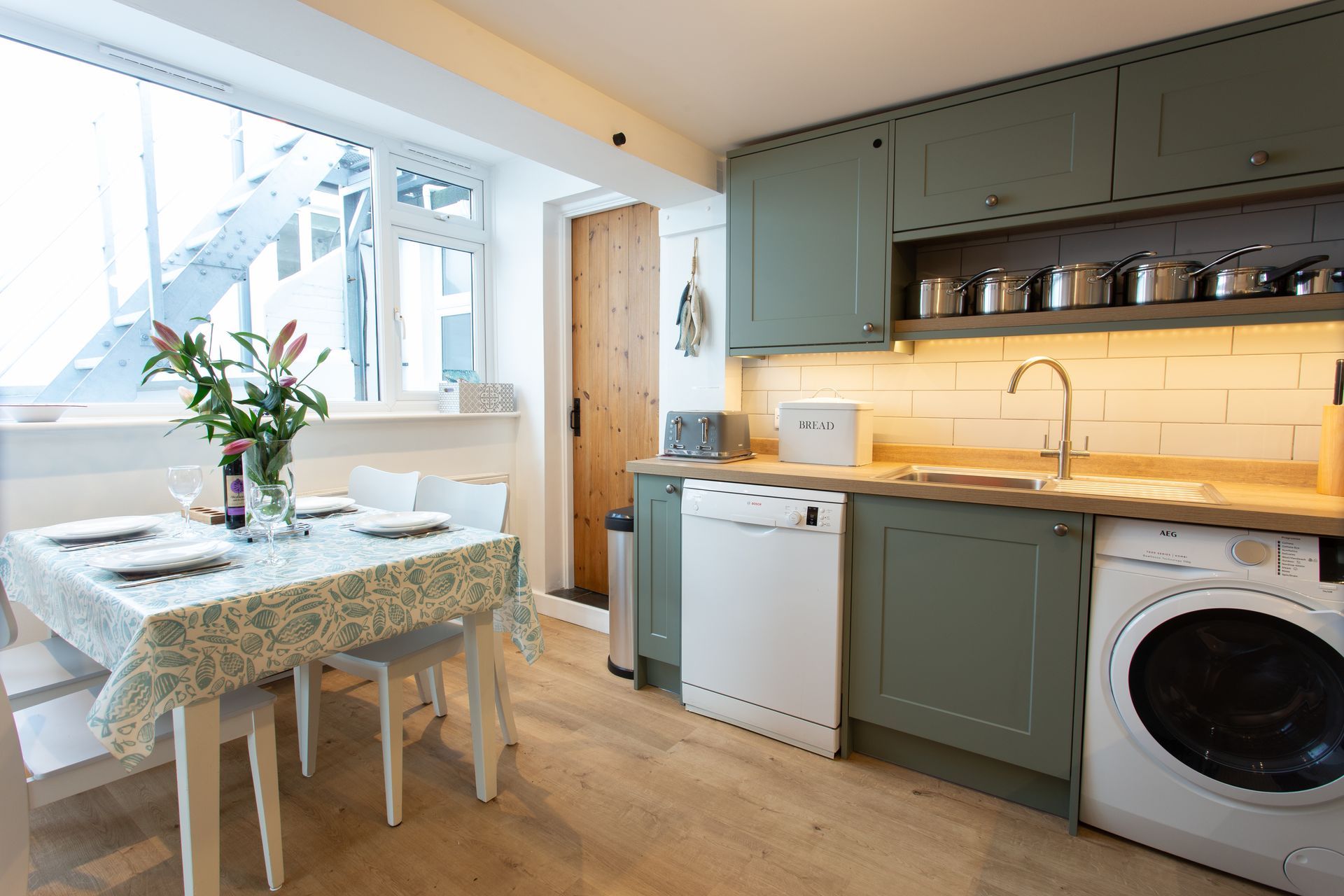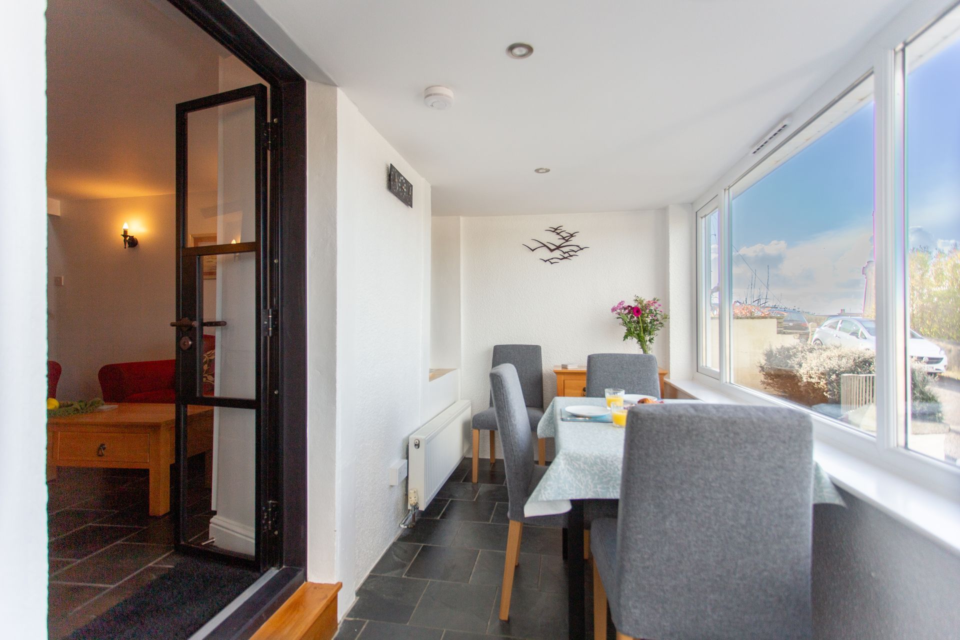 Entrance is via the conservatory, looking out over the harbour and leading into the lounge with log burner, smart TV, ample seating and leads through to the kitchen with dining table, oven and hob, dishwasher, washing machine/dryer, microwave, coffee machine and well equipped cupboards/drawers. At the rear of the kitchen is the ground floor wc with heated towel rail and sink.